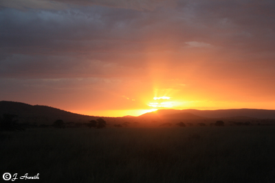 Swirls of opaque mist hide the advancing dawn. The first shafts of sun colour the fluffy grass heads rippling across the plain in a russet halo. A herd of zebras, confident in their camouflage at this predatory hour, pose like ballerinas, heads aligned and stripes merging in flowing motion.